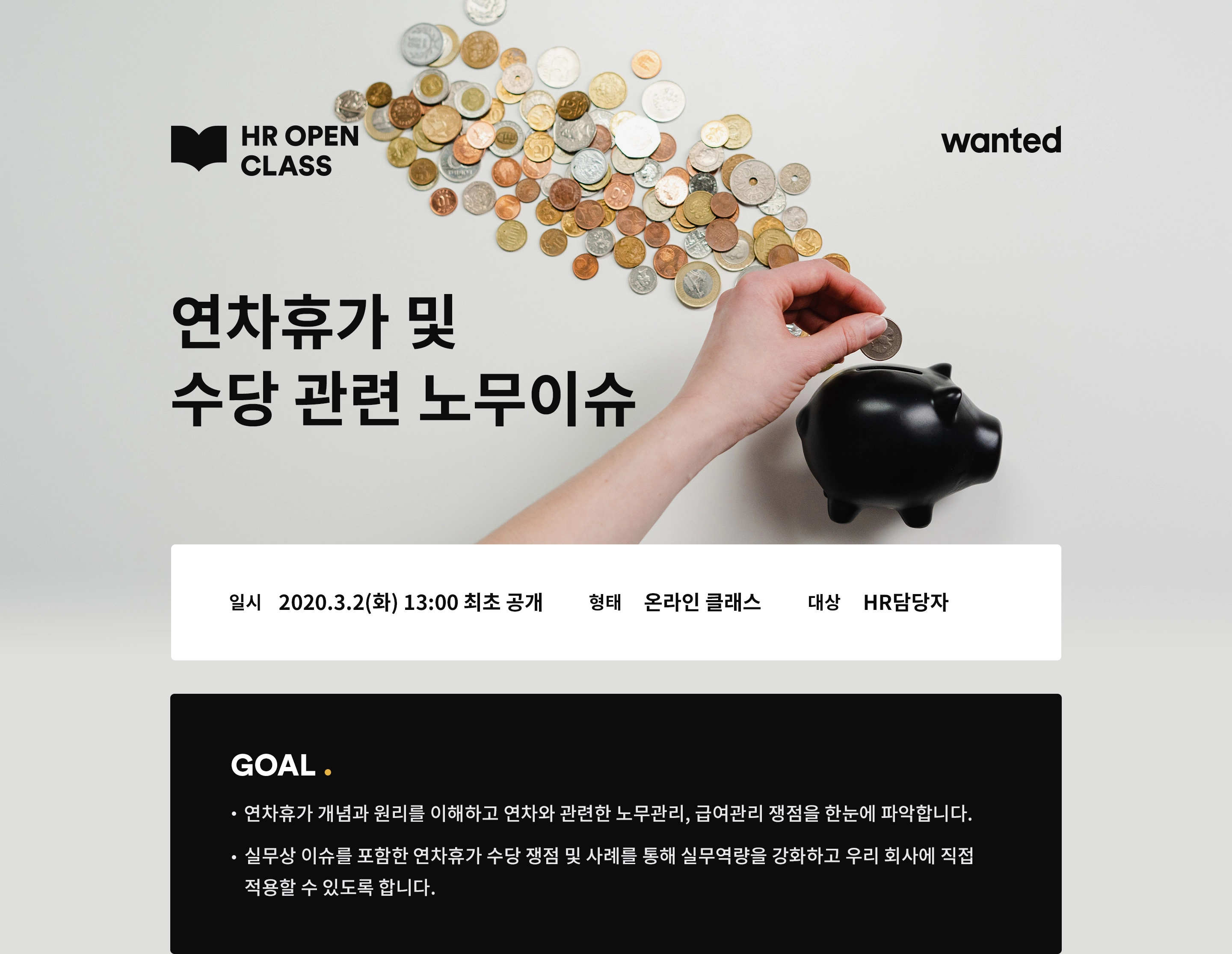 연차휴가 개념과 원리를 이해하고 연차와 관련한 노무관리, 급여관리 쟁점을 한눈에 파악해보세요. 실무상 이슈를 포함한 연차휴가 수당 쟁점 및 사례를 함께 공유합니다.(https://www.wanted.co.kr/events/hrclass210302)